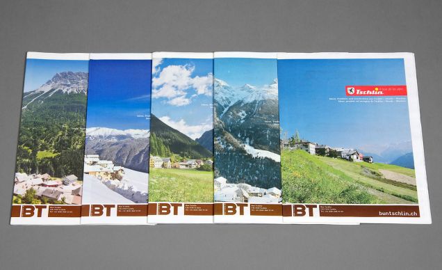 “Gazetta Bun Tschlin”, a tabloid newspaper promoting products, services and tourism from the small Romansh speaking swiss Alpine community of Tschlin in Engadine. Produced twice-yearly. Editions 2008–2011.