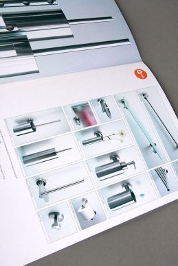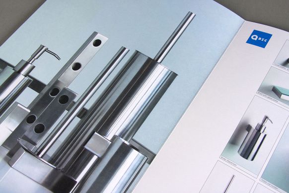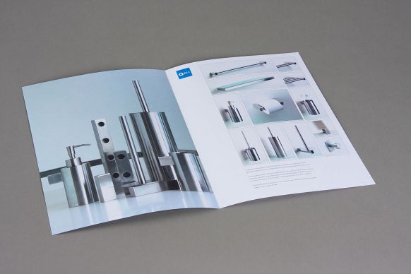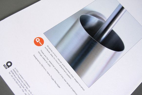 Brochures and sales folder for Q-Too, a stainless steel furniture manufacturing company in Istanbul, Turkey, featuring bathroom accessory designs from the danish designer Hans Thyge Raunkjær.